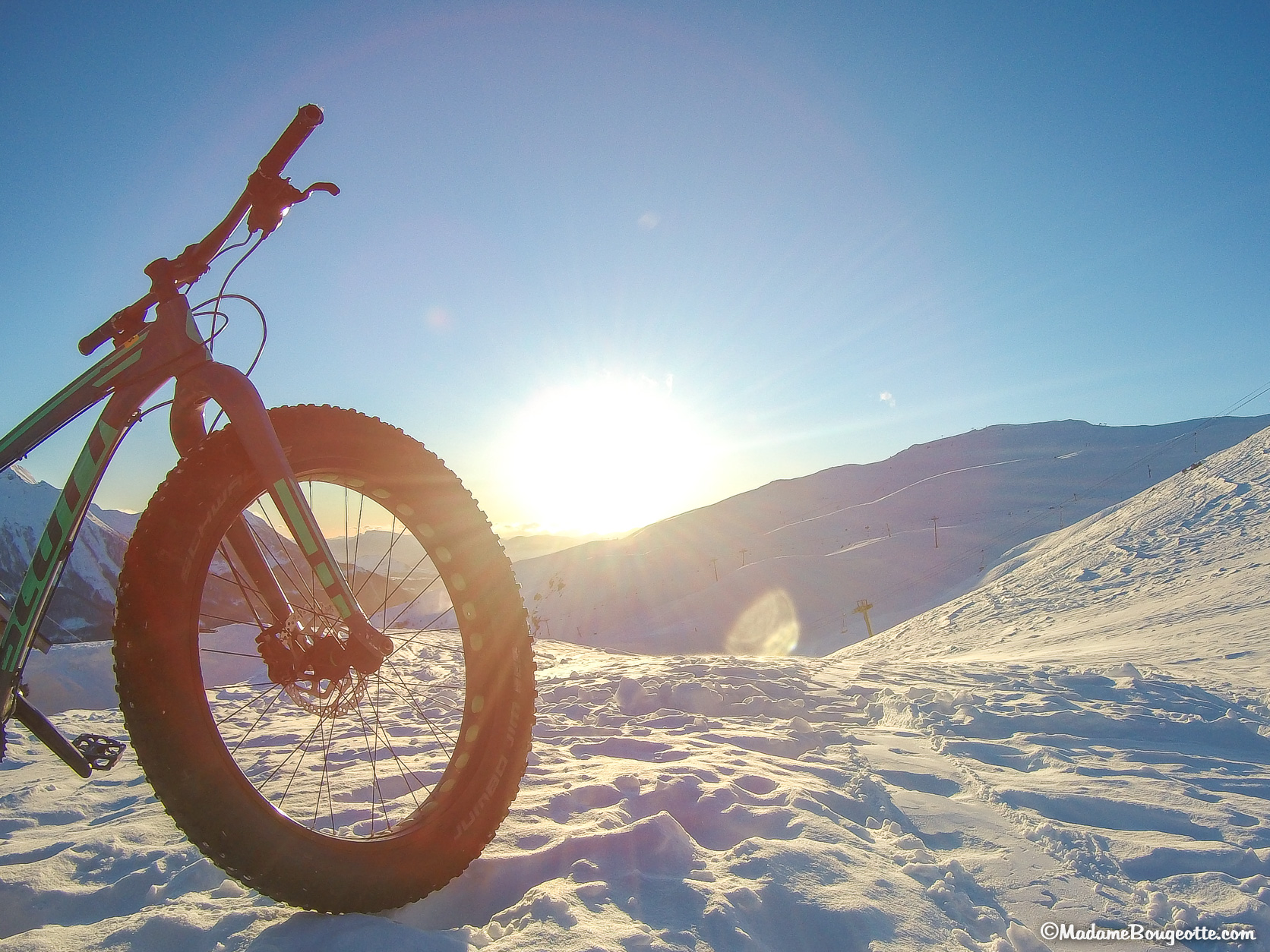 Est-ce que c’est compliqué? J’avais un peu peur mais en fait c’est assez stable, le pneu adhérant bien à la neige. Et puis ce n’est que de la descente donc, pas d’effort surhumain pour pédaler.